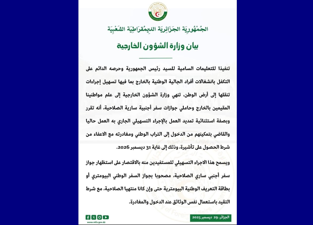 تمديد الإجراءات التسهيلية القاضية بالدخول الى التراب الوطني و مغادرته الى غاية نهاية 2026