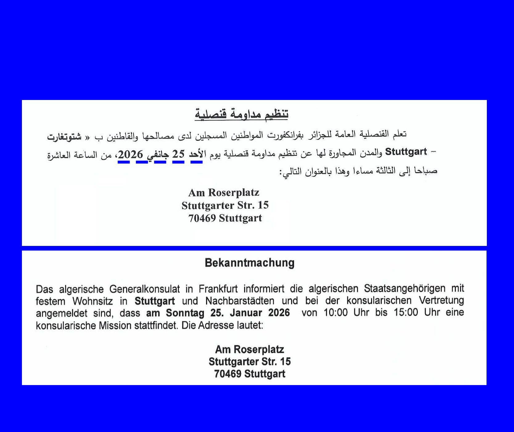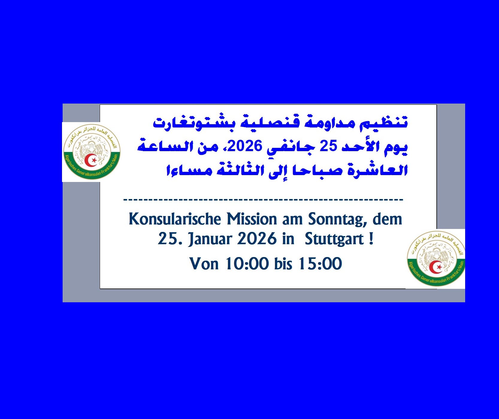 تنظيم مداومة قنصلية بشتوتغارت يوم الأحد 25 جانفي 2026، من الساعة العاشرة صباحا إلى الثالثة مساءا