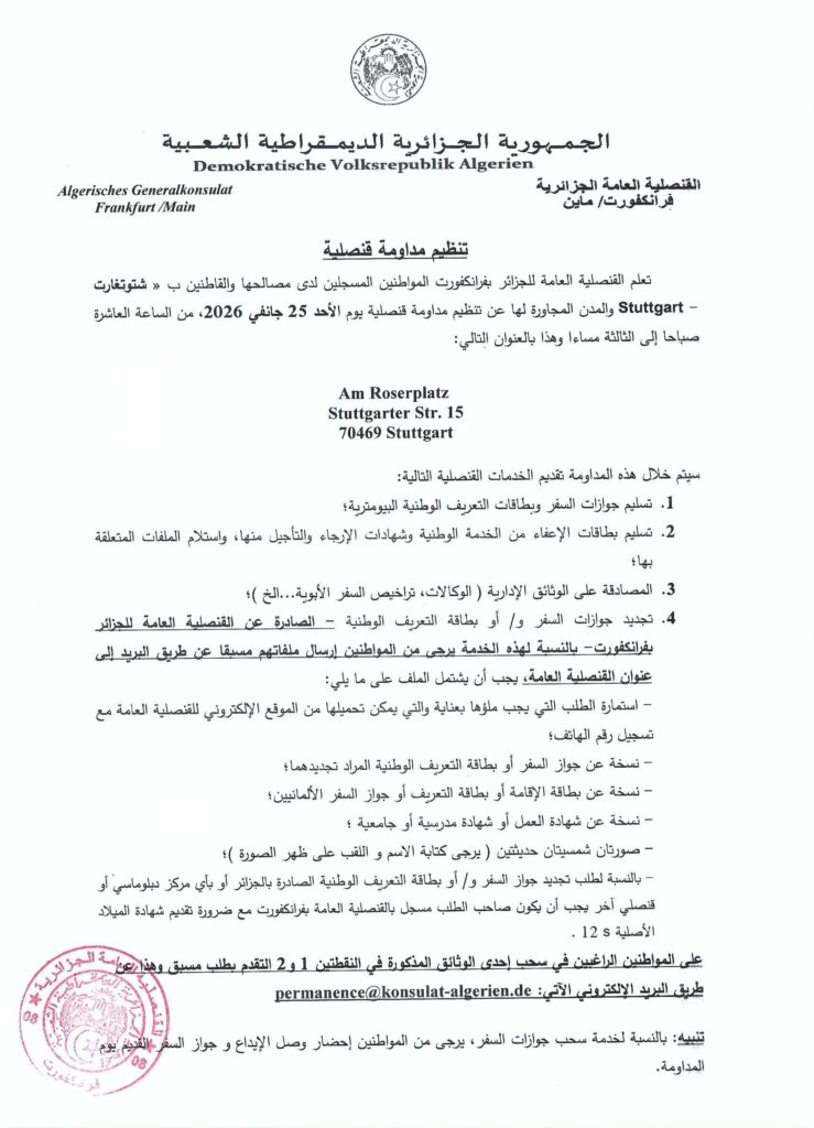 تنظيم مداومة قنصلية بشتوتغارت يوم الأحد 25 جانفي 2026، من الساعة العاشرة صباحا إلى الثالثة مساءا