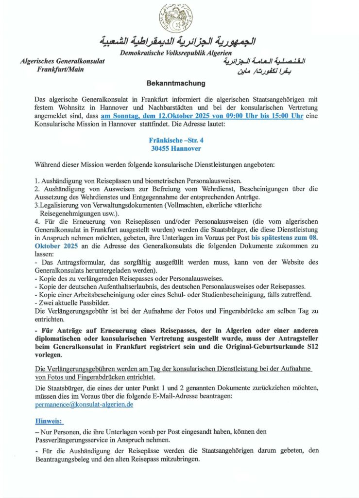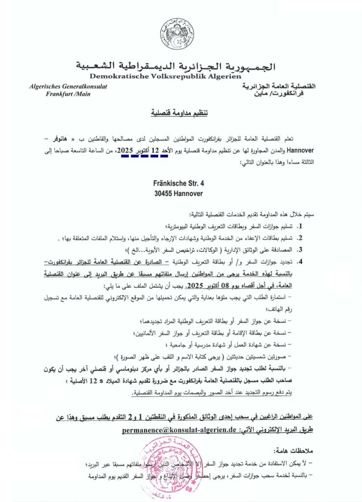 تنظيم مداومة قنصلية يوم الأحد 12 أكتوبر 2025، من الساعة التاسعة صباحا إلى الثالثة مساءا ب- هانوفر par Consulat Général7 octobre 20257 octobre 2025