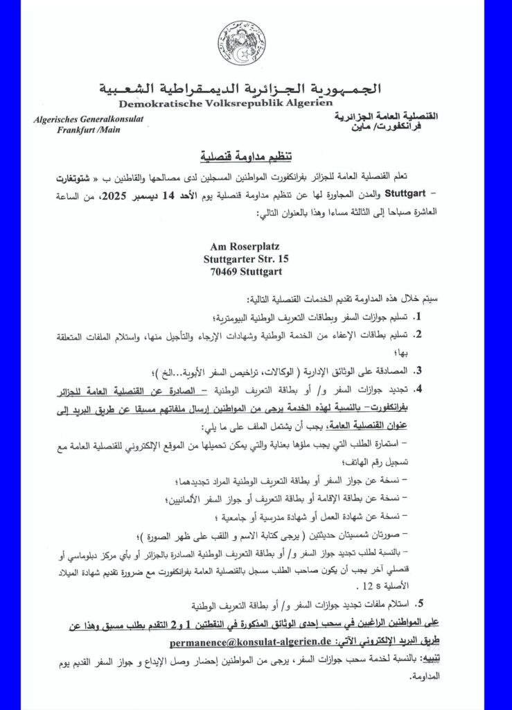 تنظيم مداومة قنصلية يوم الأحد 14 ديسمبر 2025، من الساعة العاشرة صباحا إلى الثالثة مساءاpar Consulat Général5 décembre 20255 décembre 2025 permanence@konsulat-algerien.de