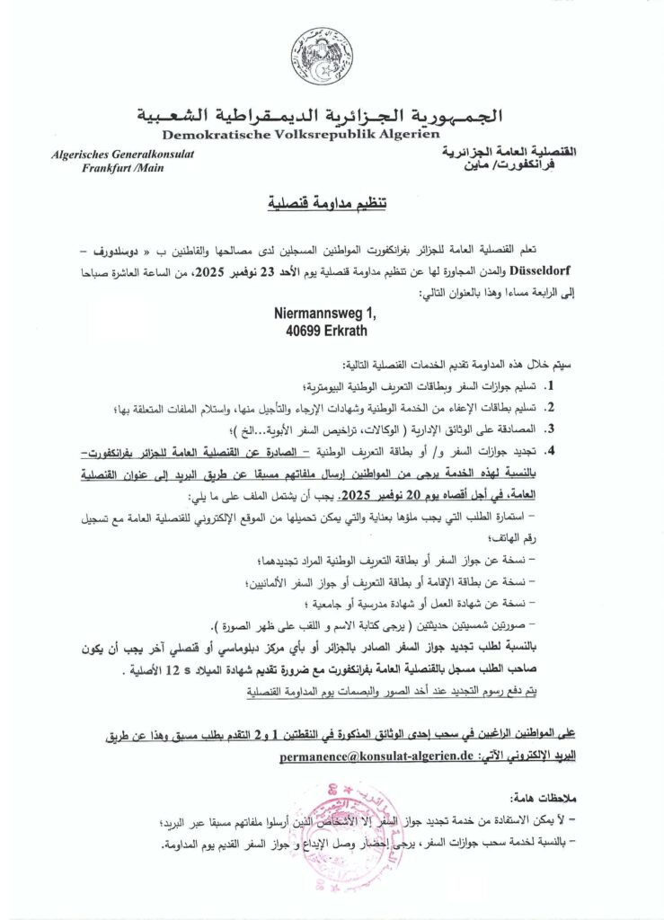 تنظيم مداومة قنصلية يوم الأحد 23 نوفمبر 2025 ، من الساعة العاشرة  صباحا إلى الرابعة مساءا وهذا بالعنوان التالي :Niermannsweg 1, 40699 Erkrath