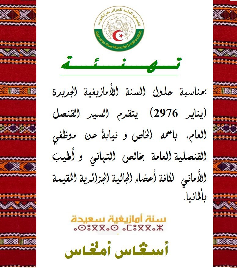 تهاني السيد القنصل العام بمناسبة حلول السنة الأمازيغية الجديدة يناير 2976par Consulat Général10 janvier 202613 janvier 2026