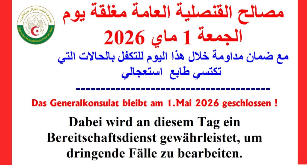 Das Generalkonsulat bleibt am 1.Mai 2026 geschlossen !
